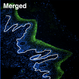 A microscopy image of vaginal tissue from a female macaque vaccinated with a version of the vaccine. The white line is the basal or base layer of the mucosal epithelium, which is the interior tissue lining; cells stained in blue have built up along the lining through the menses cycle; and cells glowing green contain the vaccine, forming the top layer of the lining, which pathogens would encounter first.