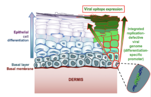 The vaccine is designed to specifically enter basal, or base, cells in the mucosal epithelium. As those basal cells differentiate to build up the epithelial tissue, the vaccine is passed on to all newly made cells (represented in green).