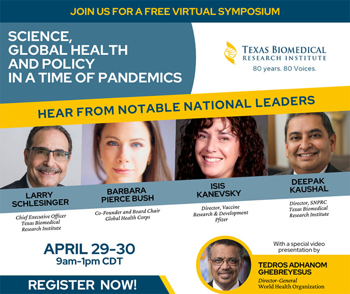 On April 29-30, 2021, Texas Biomed is teaming up with other world leaders in infectious disease to host a Virtual Global Health Symposium. As an independent nonprofit infectious disease research institute, Texas Biomed is focused on bringing together a range of thought leaders involved in global health, research, sustainability and policy.